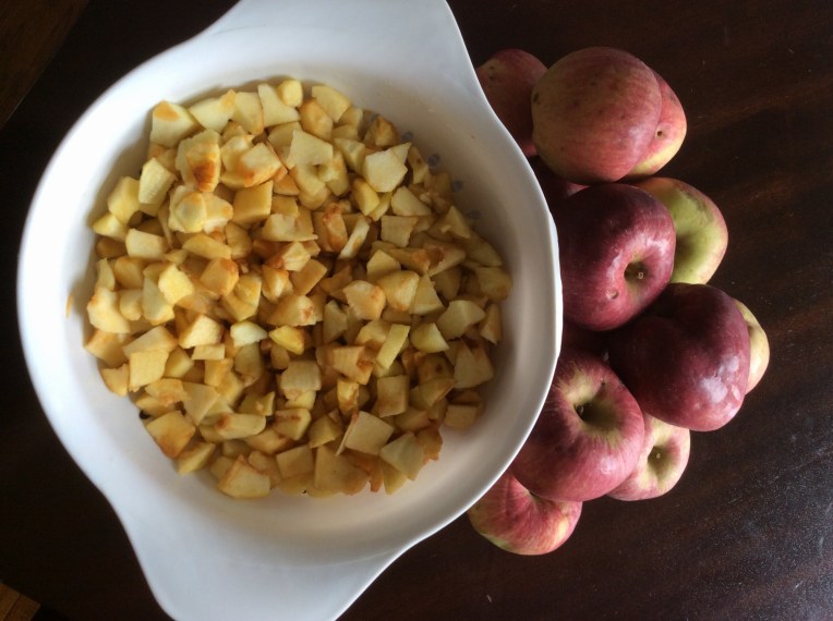 Peel the apples, cut into little cubes, and sprinkle with lemon juice to prevent browning and brighten the flavor.
