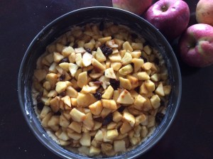 Press half of the dough into the base of the pan (do not be afraid to use your hands!), making sure to cover the edges by about an inch. Then spread the mixture of apples and raisins on top.