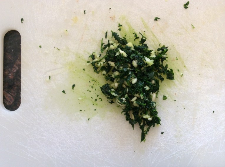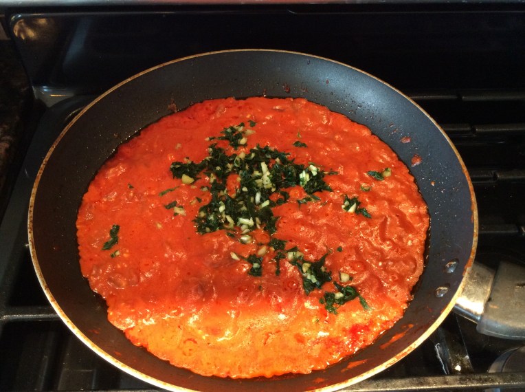 If the water has started to boil, don’t be afraid to pour in the pasta… the sauce is almost ready!    As soon as the sauce becomes thickened, add 5 or 6 drops of TABASCO SAUCE, the chopped garlic, parsley, and cream cheese. Stir the mix until  creamy and well blended, and switch of the heat.