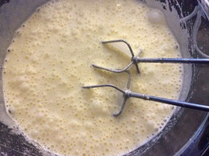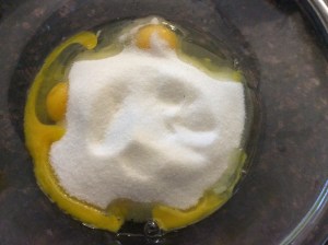 If you don’t have roasted almonds, just put your almonds in the oven for 5 minutes at 375 degrees, and then let them cooled off. In a bowl, whisk the eggs and the yolk with a pinch of salt and the sugar until they become white and fluffy.