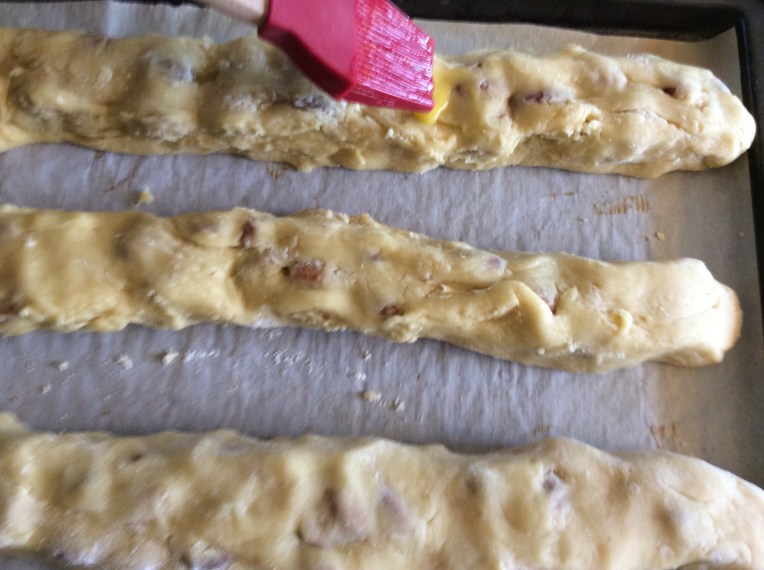 Place the loaves on one or two baking sheets, lined with parchment. Remember that they will raise a bit so place them at a reasonable distance, and brush them with a beaten egg.