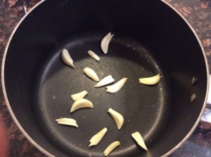 Put the water in a big pot at medium heat.  While you wait for the water to boil, peel off the garlic’s cloves, cut them in two pieces.