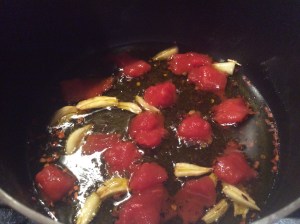 When the garlic seems golden, add the diced tomatoes and let the sauce cook for a couple minutes more.