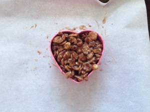 When the mixture is still warm, give to the rice the shape you prefer: you can make a loaf, pouring the mixture in a aluminium foil;  you can make a big bar pouring the mixture in a rectangular dish; or you can make many small hearts, by using a cookie cutter (the one I used is about 2 x 2 inches).