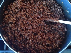 Turn the heat off and add gradually the crispy rice into the chocolate. Stir until all the rice is covered in chocolate.