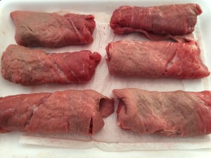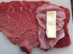 Now wrap the ham and cheese pocket with the slice of beef, tucking in the top and bottom edge of the beef slice as you roll.  When you have the ham pocket covered completely, cut off the surplus (you could use it later, for a delicious Bistecca alla Milanese).