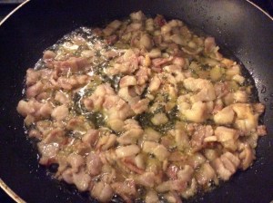 Now dice the bacon and brown it in a pan with the remaining oil until crispy.