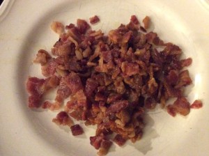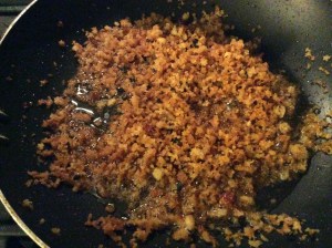 Remove the bacon from the pan with a slotted spoon and set aside. In the remaining oil in the pan, toast the chopped bread with crumbled thyme.