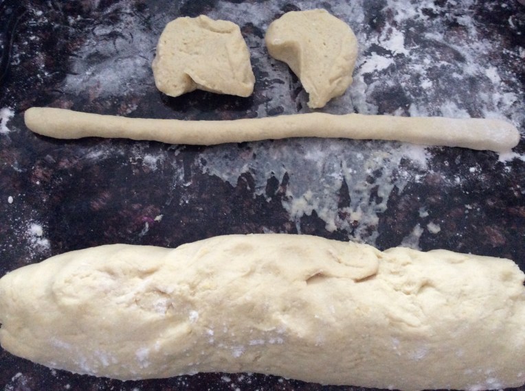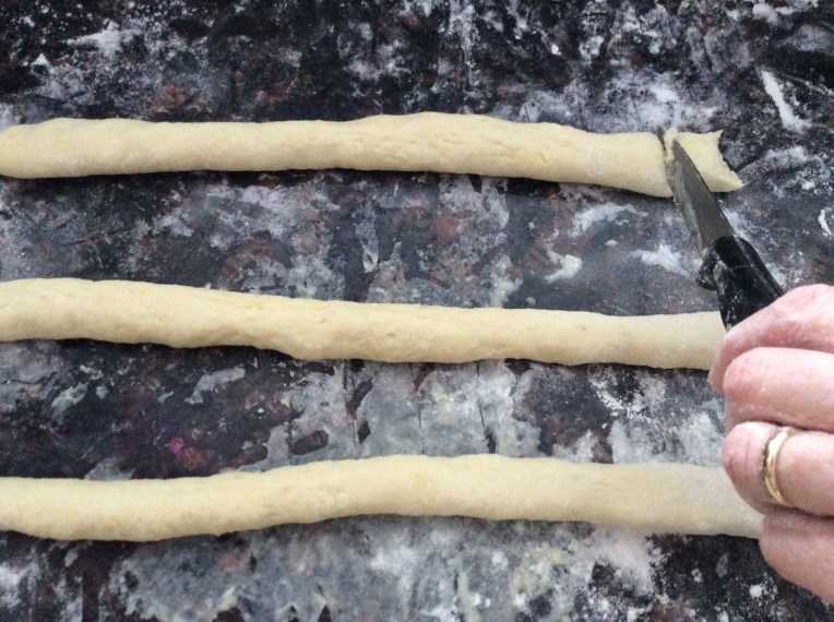 Being careful to keep the work surface floured, form a loaf, cut into slices, then roll each slice into long, thin rolls about 1 inch wide.