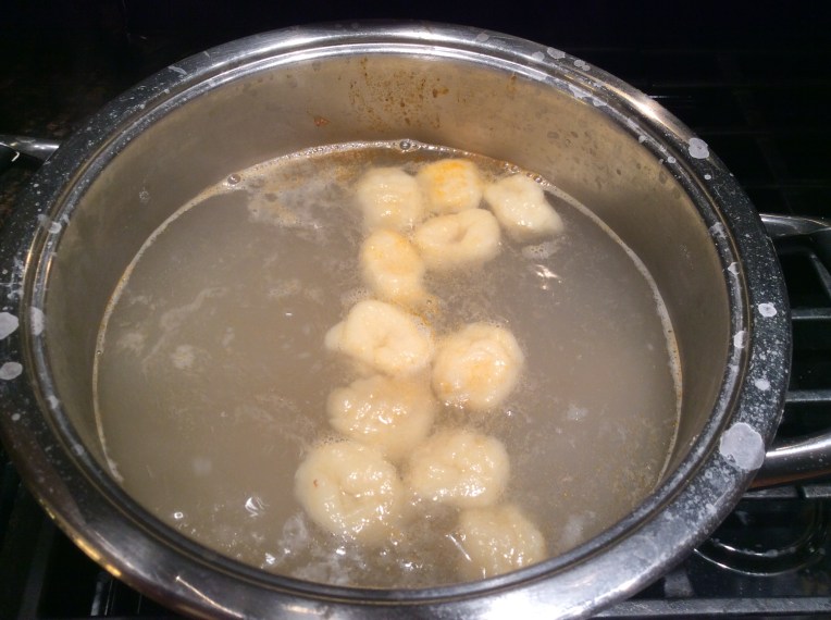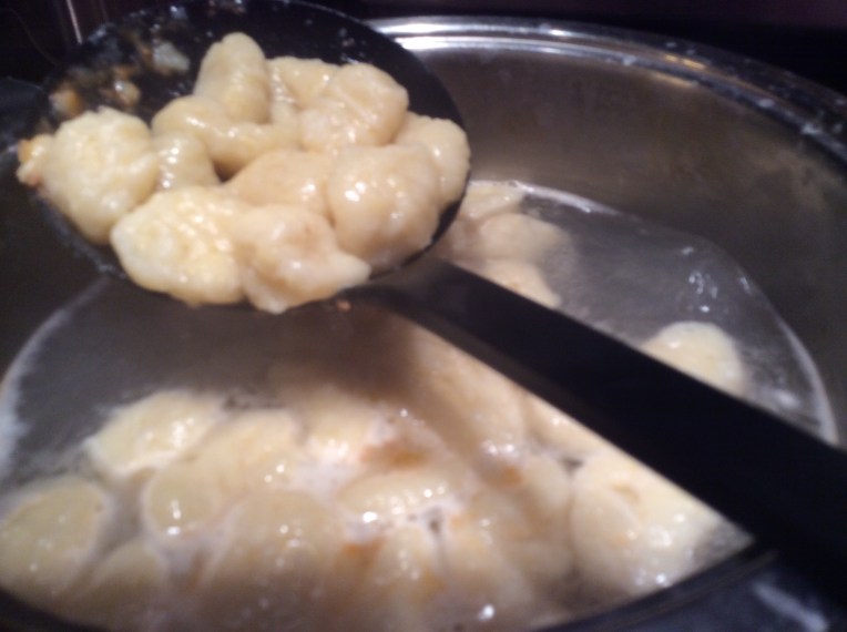 Once the water is boiling, cook the gnocchi by dropping them in the water a few at a time, cooking in small batches so they will not stick together. I would suggest cooking about 20-25 Gnocchi at a time.