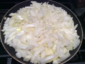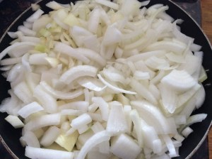 In a pan, pour 5 Tbs. olive oil, add the onions and cook on medium heat, stirring occasionally, for about 20 minutes.