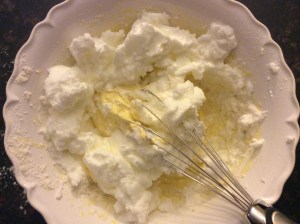 Next, add the beaten egg whites, gently folding them in using a whisk. Be careful not to lose the frothiness.
