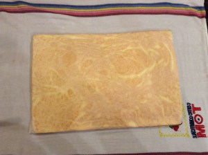 Again, roll the sponge cake the long way (top/bottom in these pictures), wrap the aluminum foil around it, and place in the freezer for at least two hours.