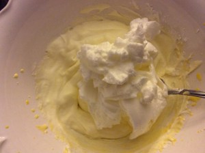 Fold into the beaten yolks the whipped cream and the egg whites, a little at a time, stirring gently from the bottom to the top.