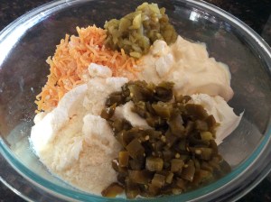 Mix cream cheese, mayo, shredded cheddar, Parmesan/Asiago/Reggiano blend, drained diced green chilies, and jalapeños in a bowl using first a spoon and then an electric mixer.