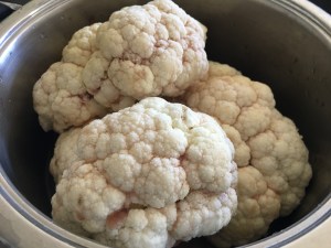 Arrange the cauliflower in a stainless steel pot, with just an inch or so of water. Drizzle the vegetable with red wine vinegar. (It will not leave any taste, it is just a tip to avoid your kitchen smelling of cauliflower the entire week!). In my pot, I put the lid on, let the water reach the boiling point, then move the pot to low heat and let the cauliflower steam for about 20 minutes. Be careful not to overcook it; the cauliflower should become tender but keep its shape- not become mush.