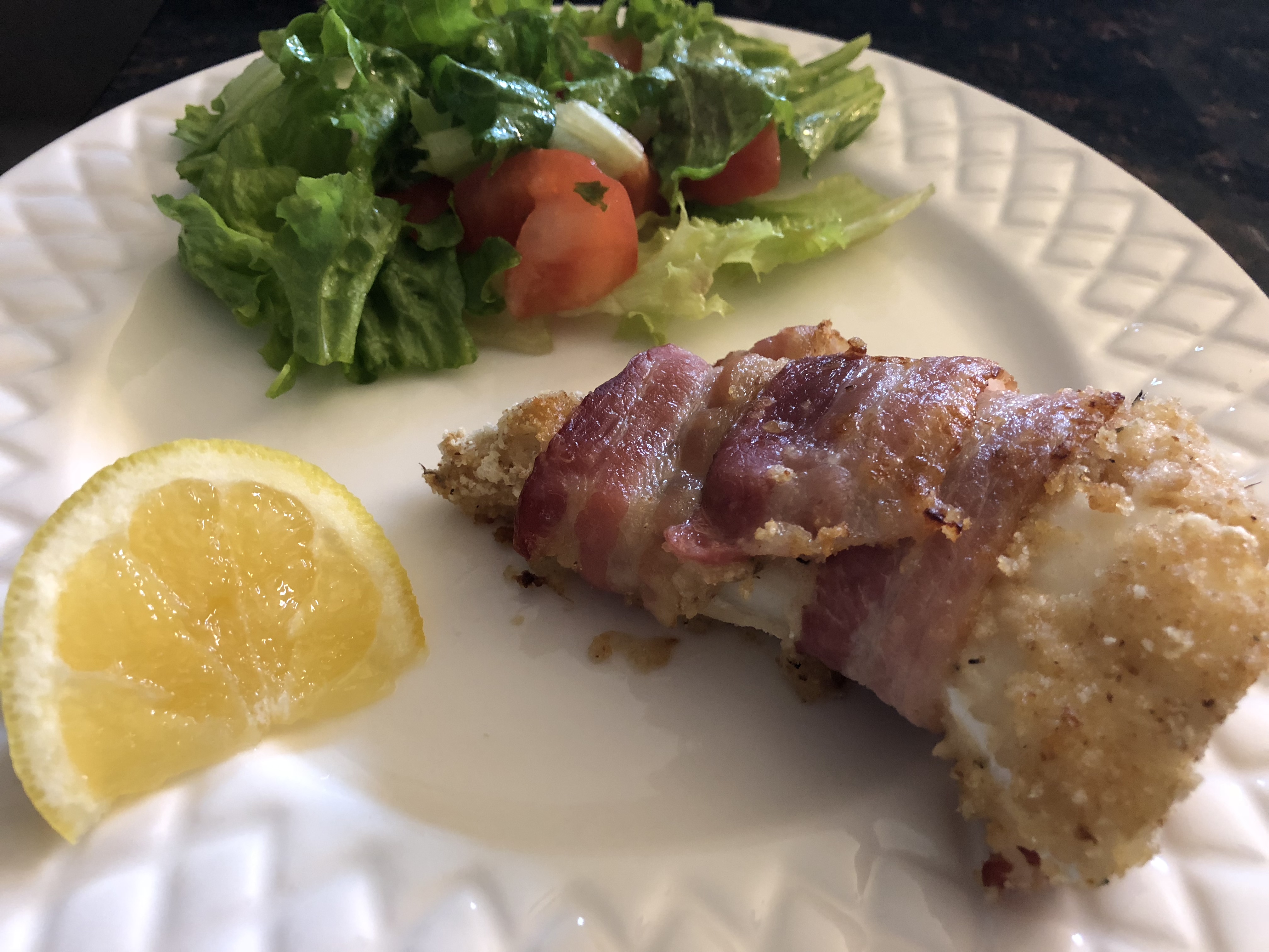 Oven baked, bacon wrapped, cod fish. Light, crunchy, and so good!
