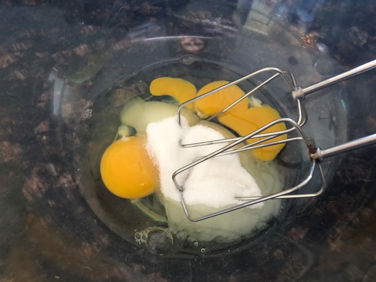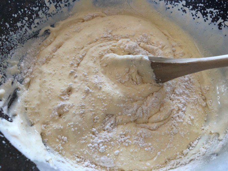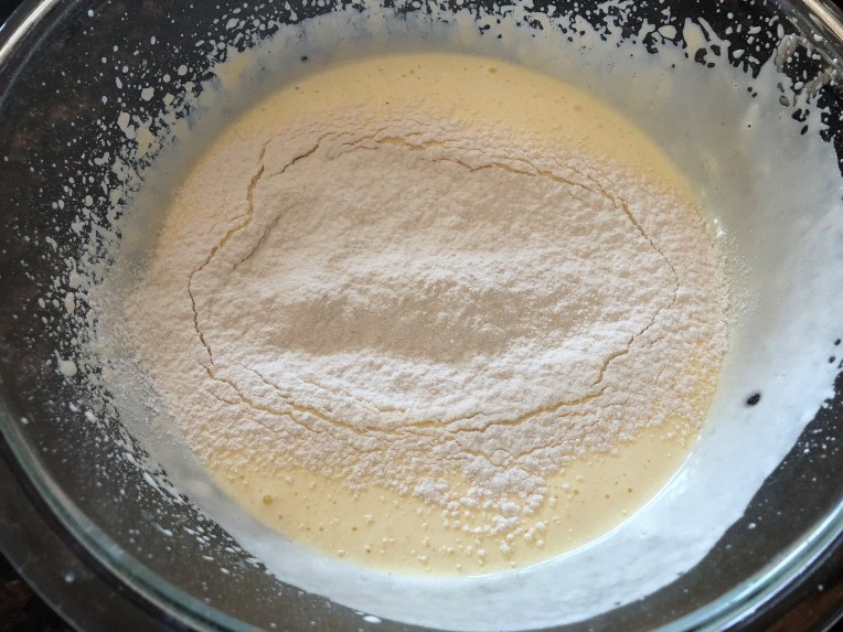 For the sponge cake:  Beat the eggs with the sugar until shiny and stiff. It may take about 20 minutes. Use an electric whip or a kitchen aid for the job (this phase is very delicate because if the eggs don’t incorporate enough air, the sponge won’t rise). Add the sifted flour and the extracts and stir gently from the bottom to the top to avoid losing the volume and get a runny batter.
