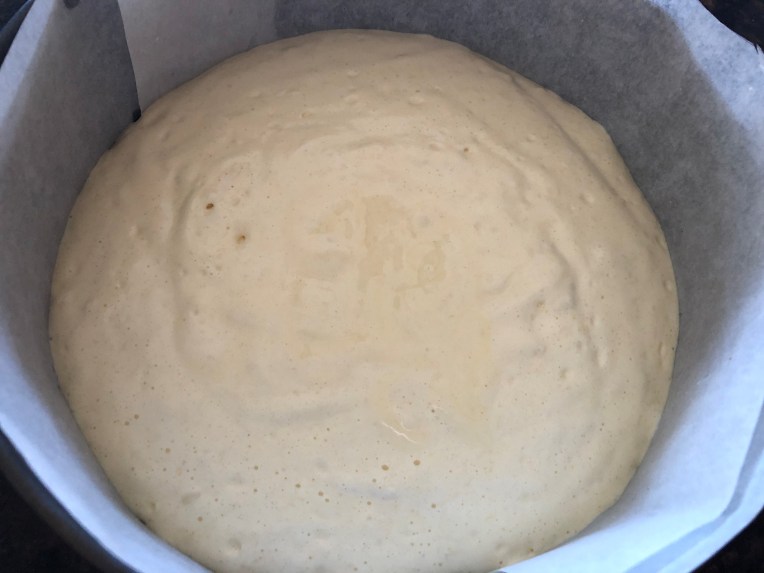 >Pour the batter on a 8″ springform pan lined with parchment and bake at 355 F. (175 C.) for about 40 minutes or until the top gets golden.  Let it cool off before taking out of the springform pan.