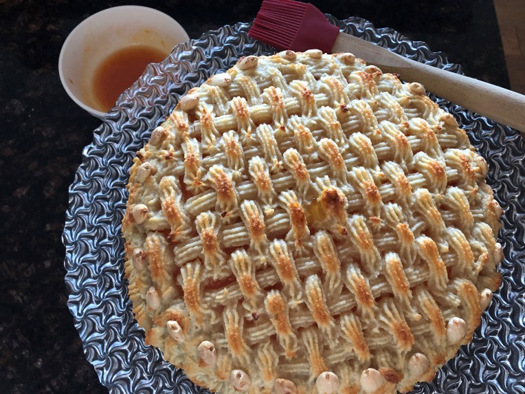 Once the almond paste is set, bake the cake again for about 20 minutes at 360 F (180 C.) until the paste get slightly colored. Let the cake cool off and shine it with some apricot preserved mixed with sugar syrup.