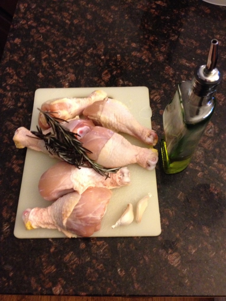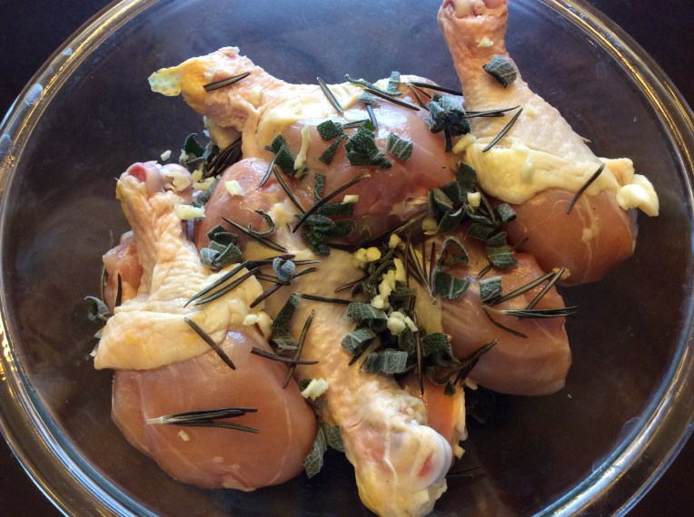 In a bowl rub lightly each chicken drumstick with virgin olive oil and then sprinkle with chopped sage and rosemary,  and few garlic cloves very finely cut.