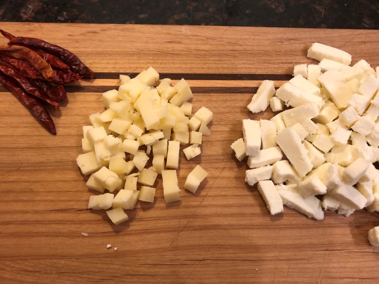 Cut the mozzarella in small cubes. The smaller are the cubes, the fastest they will melt. I like to add to the mozzarella also asiago cheese cubes. Take the toasted bread out of the oven and spread the slices with the tomatoes sauce mix.