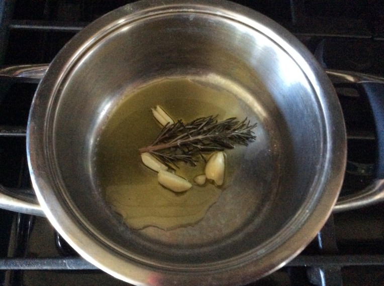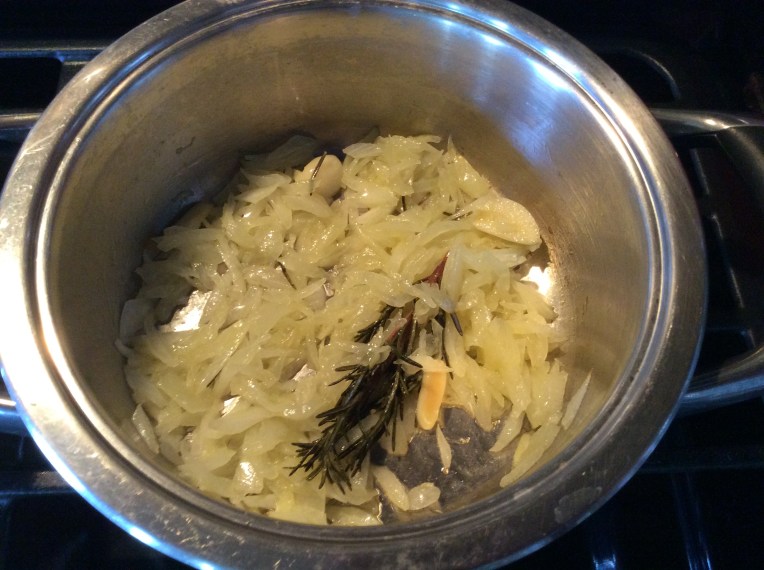 In a sauce pan, heat at medium heat about 3 tbs. virgin olive oil, the garlic cloves cut in four, the rosemary spring and the finely chopped onion.