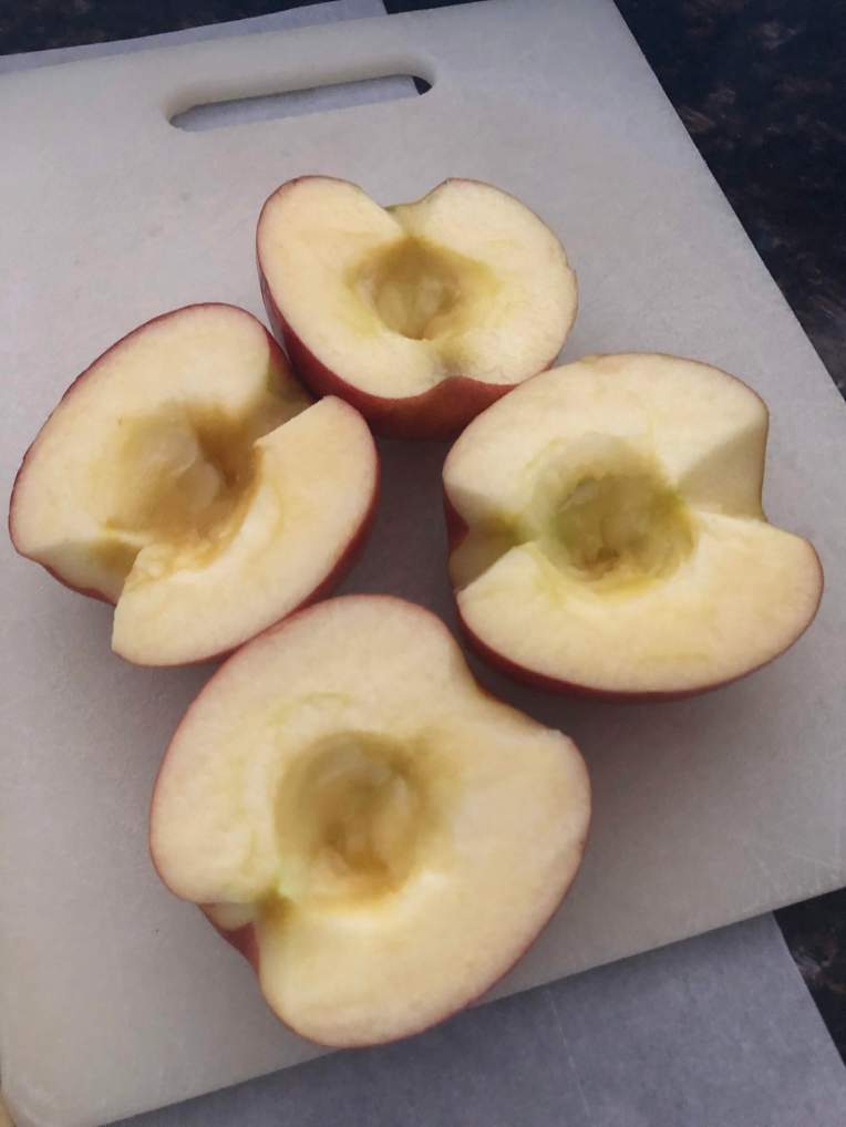 Wash the apples, take away the stem and core, and cut in very thin slices (thin because otherwise it will be impossible to shape them).