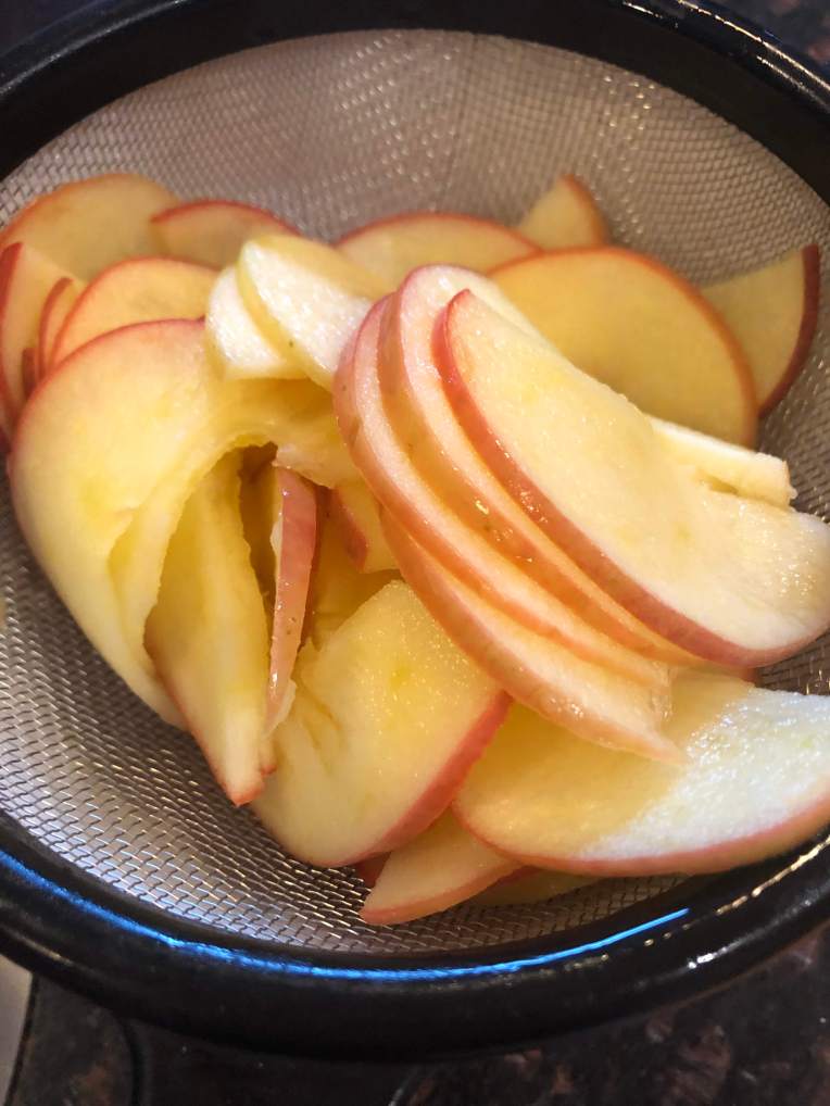 Place the apple slices in a bowl with 2 tbs. of sugar (even the brown one works very well), the lemon juice and a couple of tbs. of water and microwave for about 2 minutes. Once microwaved, drain the apples in a strainer to get rid off all the extra juice.