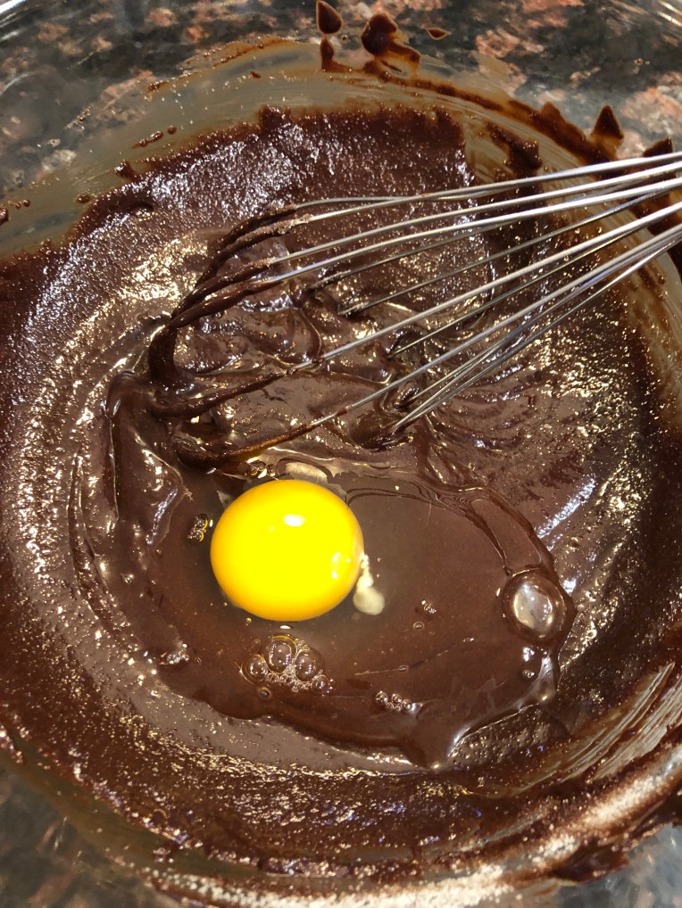 Take the melted mix away from the heat, add the sugar and hand-whip. Then add one egg at a time and keep whipping. Finally, add sifted flour and stir.