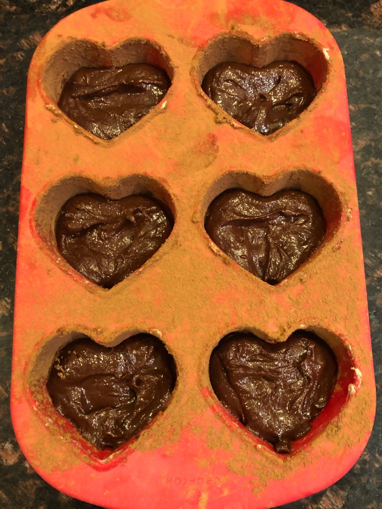 Preheat the oven at 410 F (200 C.). Once the flour is evenly incorporated to the batter, scoop one tbs. of batter to each heart. Take away the Nutella from the freezer and place each single frozen block of Nutella in each heart. Cover the nutella with the remaining batter.