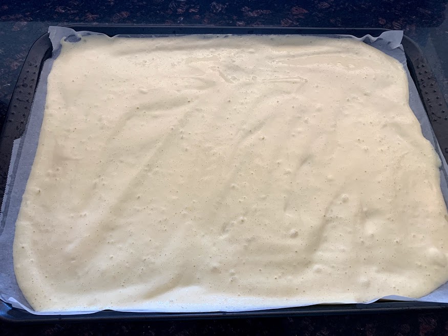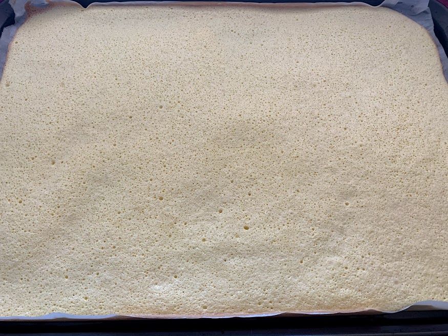 Pour the batter in a 20”x14″ (45×37 cm) baking sheet lined with parchment paper. Try spreading the batter uniformly and bake (preheat the oven) in the middle rack at 375 F. (190 C.) for about 12-13 minutes. When you’ll take the cake out of the oven its surface must be still soft.