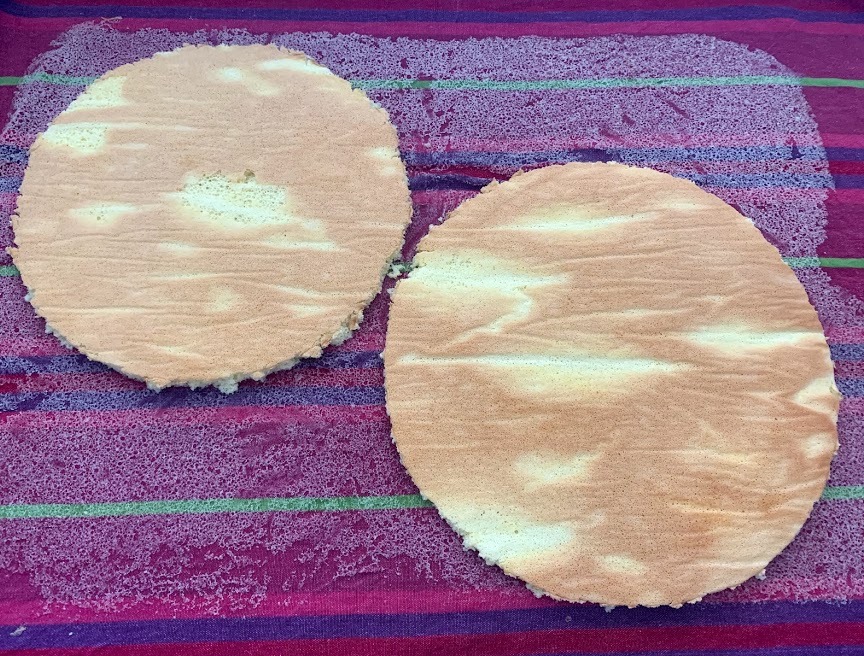 Get a clean kitchen cloth, drench it in water, squeeze it to get rid off the excess of water, take the sponge cake out of the oven and flip it onto the wet cloth. Peel off the parchment paper and cover the entire cake’s surface with plastic wrap. When completely cooled, cut two circle out of the sponge cake: a 10” one and a 8″ one.