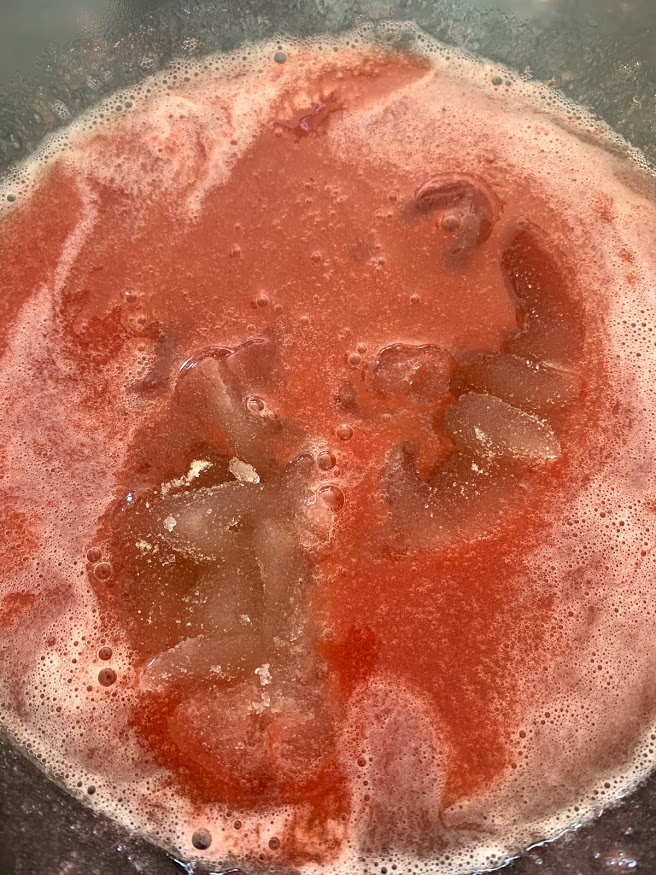 NOW START PREPARING THE MOUSSE: wet the gelatin leaves in some cold water for at least five minutes. In medium size pot, add water, sugar and the 12 oz. (340 gr.) strawberries cut in cubes. Bring the mix to boil and cook at medium heat for 2-3 minutes. Don’t overcook because you need the mix to be very liquid. Blend the mix with an immersion blender.