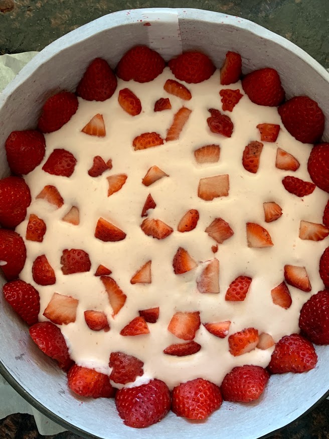 NOW LET’s START TO BUILD THE CAKE! Line the 10″ spring-form pan with parchment and arrange first the 10″ sponge disk, and then – around the pan’s edge – the “half strawberries”.