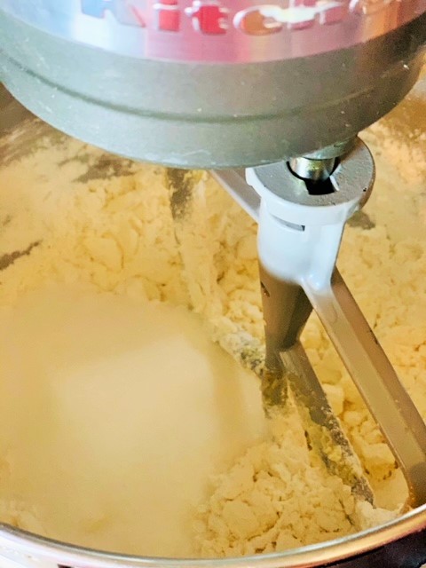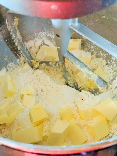Prepare the short crust pastry either by hand or using your stand mixer by following these simple steps: place flour and cold cubes of butter and mix for a minute until you obtain a sandy dough. Then add the sugar, pinch of salt and lemon extract and mix until sandy again.