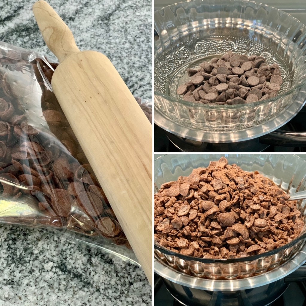 - FIST LAYER , THE CHOCOLATE PEBBLES BASE. If you are using chocolate pebbles cereals, make sure to crumble it in a zip-log bag. You can skip this passage if you are using rice crispy instead. Double boil the 2/3 cup dark chocolate and when melted, mix in the crumbled cereals (or the rice crispy). Mix very well and then spread it inside the cake ring. Try to flatten it heavenly. Place the dish in the refrigerator and start preparing the cheese cream.
