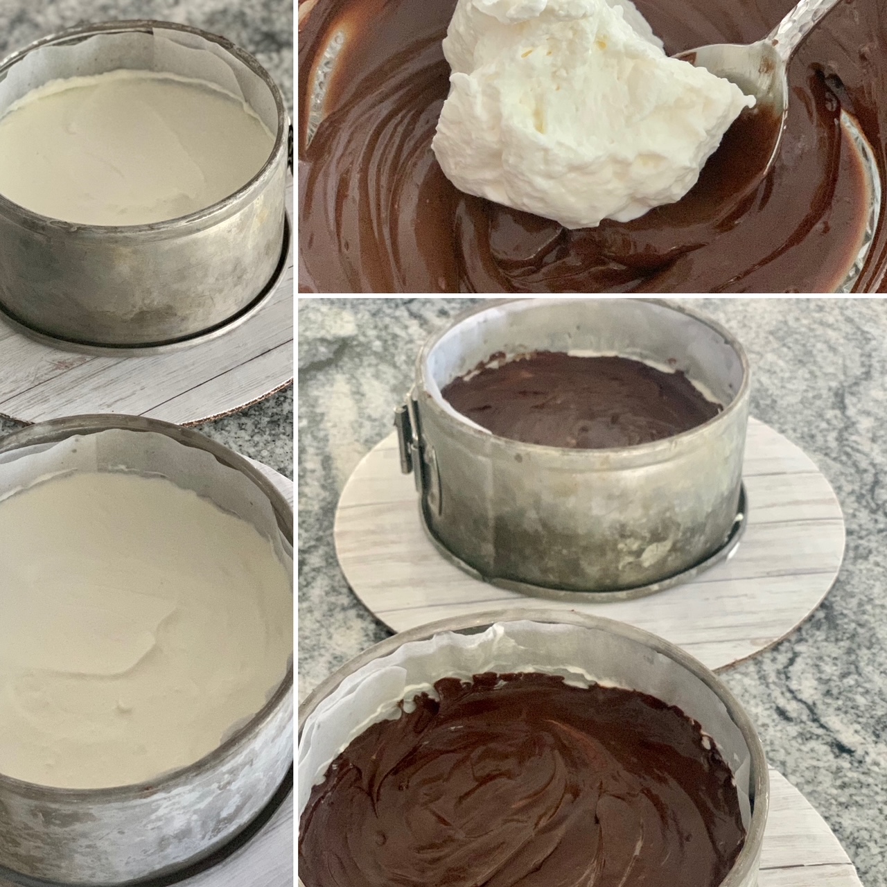 - LAST LAYER: THE DARK CHOCOLATE GANACHE Double boil the dark chocolate and when completely melted stir it quickly to cool it off a little. Add the heavy whipping cream set aside and stir gently. Pour the chocolate on top of the cream cheese filling and allow at least four hours to the cake to chill.