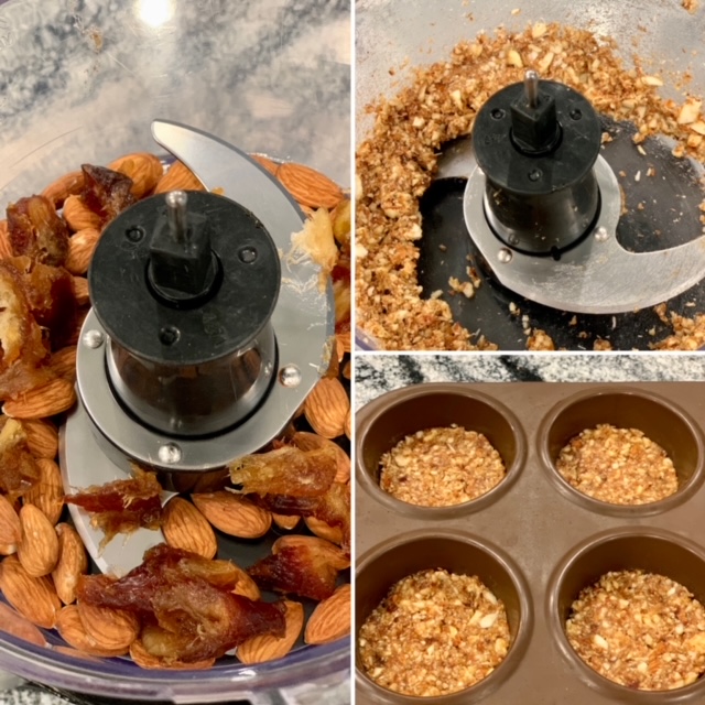 Using the food processor mix dates and almond to get a sticky batter.  Divide the batter into four silicon cupcakes molds. Press with a spoon to make the bases even and place in the refrigerator.