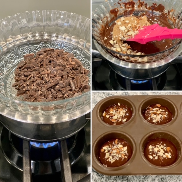Prepare now the filling by double boiling the chopped dark chocolate. Once melted mix in the peanut butter and a tbs. of chopped peanuts or almonds.   Pour the filling equally on top of the four mini bases and decorate with few more chopped almonds or peanuts.