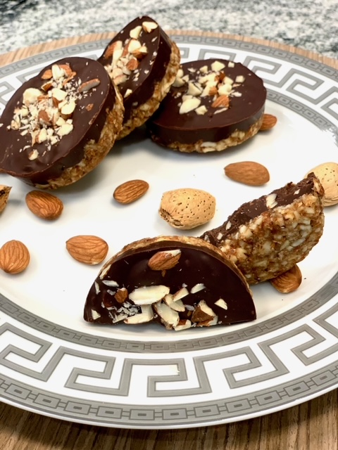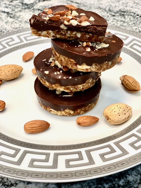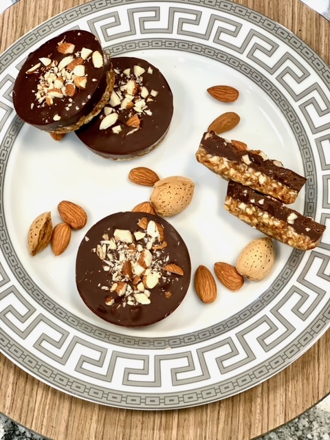 The base, dates and almonds, has a soft but solid texture and the filling has a fudgy consistency interrupted every now and then by a piece of peanut (or almond). In other words, a crunchy snack, rich in good fats, rich in protein (those contained in the peanut butter) and free of processed sugar if you opt for a 90% dark chocolate.