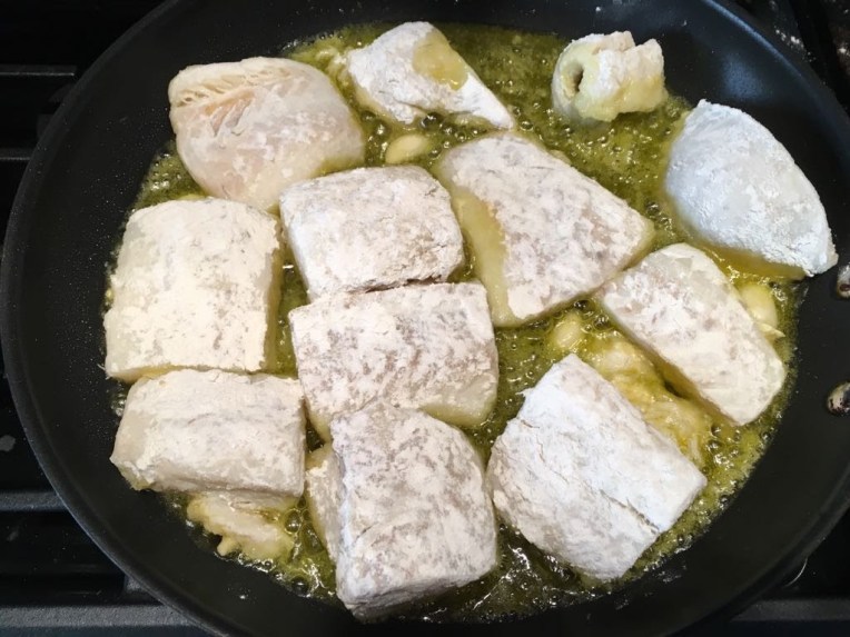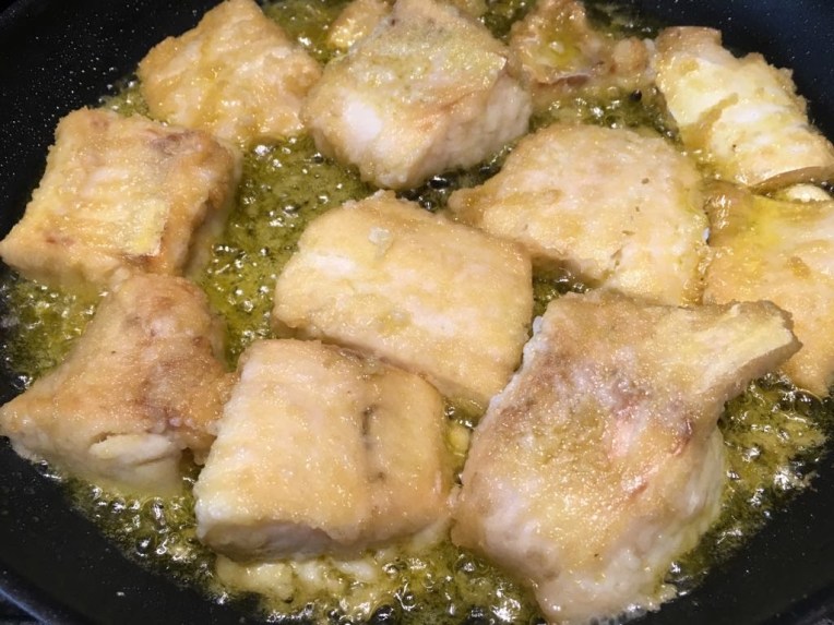 In a very large nonstick pan heat about 8 oz. (250 ml.) Extravergin olive oil and garlic and then cook the cod filets on all sides until brow, at high heat. It will take about five minutes.