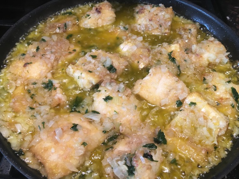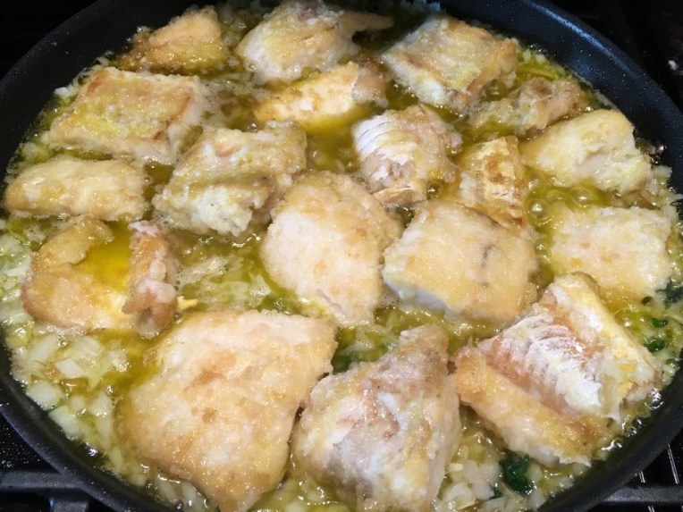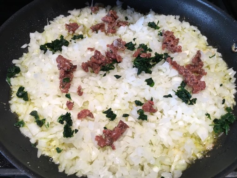 Once browned, throw the garlic away, move the cod filets in a plate, add a little of Extravegin olive oil to the same pan and cook the mix of onions, parsley and anchovies for about 5 minutes at lower heat, stirring every now and then to avoid burning.