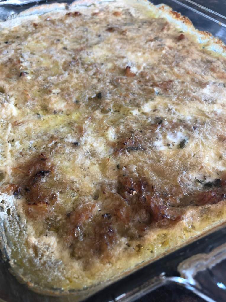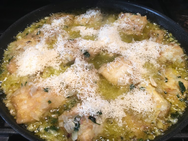 After about 5 minutes, add the browned cod filets to the onion and keep cooking until the onion becomes translucent and the cod starts breaking in smaller pieces. Add the parmesan and the nutmeg and keep stirring occasionally until the onion is completely cooked. It will take about 8-10 minutes.