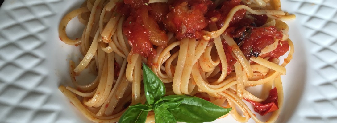 Just a few days ago a dear friend gave me a bag of fresh organic tomatoes so perfect, I couldn’t help but take a picture! So I decided to make one of my favorite pasta recipes- one that calls for up to a pound per person of fresh tomatoes, and creates a delicious, nutritious, inexpensive, and family-friendly dinner. If you think you may like my idea, harvest your tomatoes and get ready to cook!