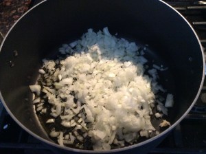 In a big pot, pour the 5 tbs. of olive oil and as soon as it starts to be warm, add the onion already chopped.