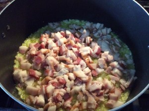 Let the onion brown, and then add the bacon, the rosemary, and crushed red pepper. Let them cook for 3-5 minutes at medium heat.