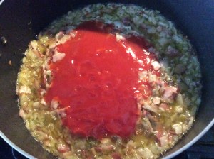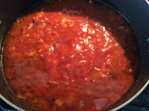 Now add the diced tomatoes and tomato sauce, stir a little, turn the stove on high heat, and let your sauce reach the boiling point uncovered (it should take 10 minutes, keep stirring sometimes).