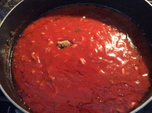 Now add the diced tomatoes and tomato sauce, stir a little, turn the stove on high heat, and let your sauce reach the boiling point uncovered (it should take 10 minutes, keep stirring sometimes).
